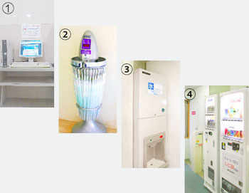 Cロビーと各階にそれぞれ、お飲み物の自動販売機がございます。ロビーではパンやカップ麺などもお求めいただけます。